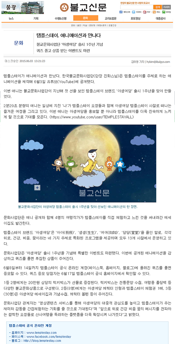 이상원 회원(한성대 애니메이션전공 교수, 명예회장)이 제작한 템플스테이 홍보용 애니메이션<아생여당 애니메이션>이 지난 6월3일자 <불교신문>에 보도 되었으며, 한국불교문화사업단은 이 애니메이션을 유튜브(YouTube)에 공개했다.